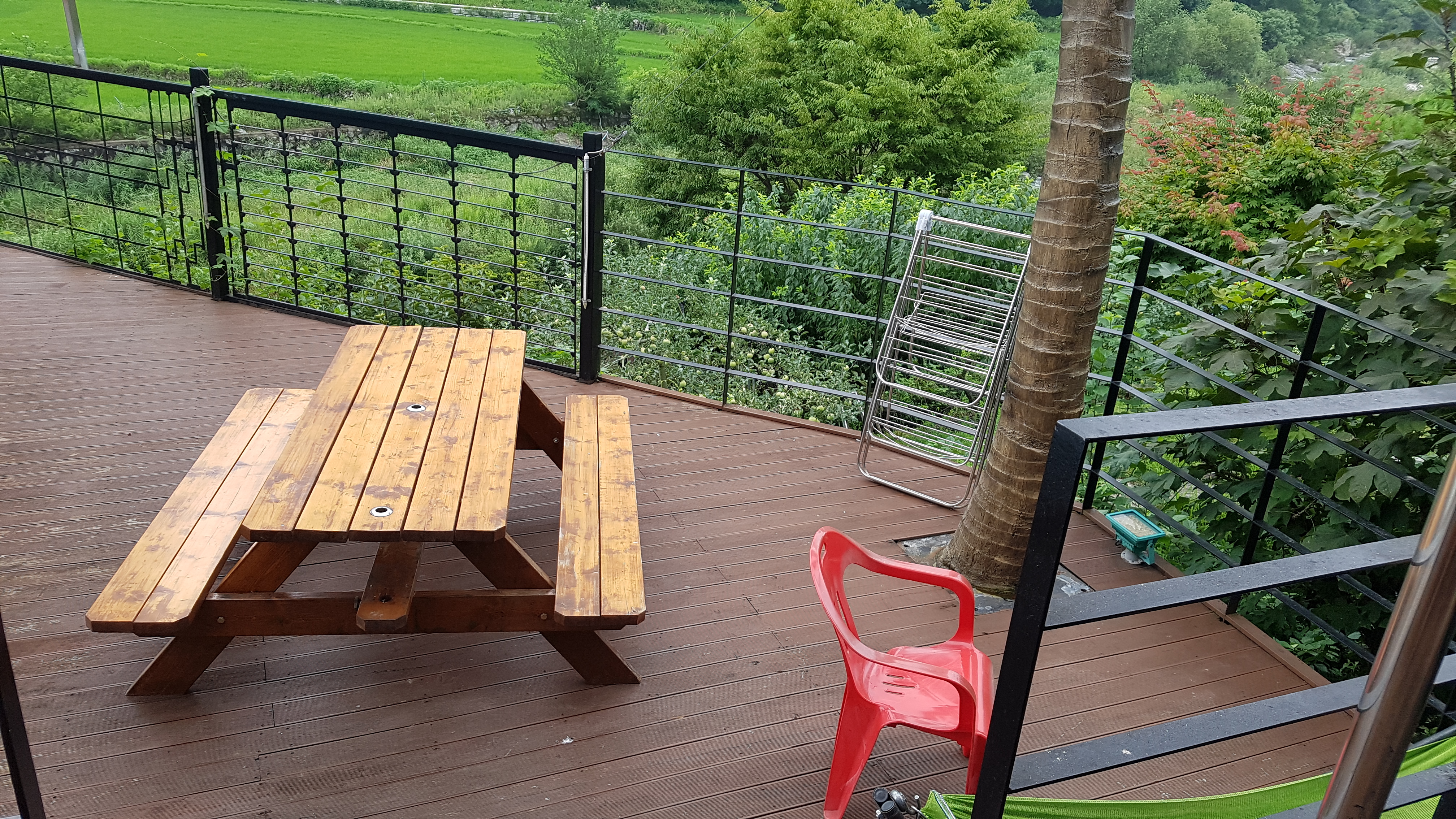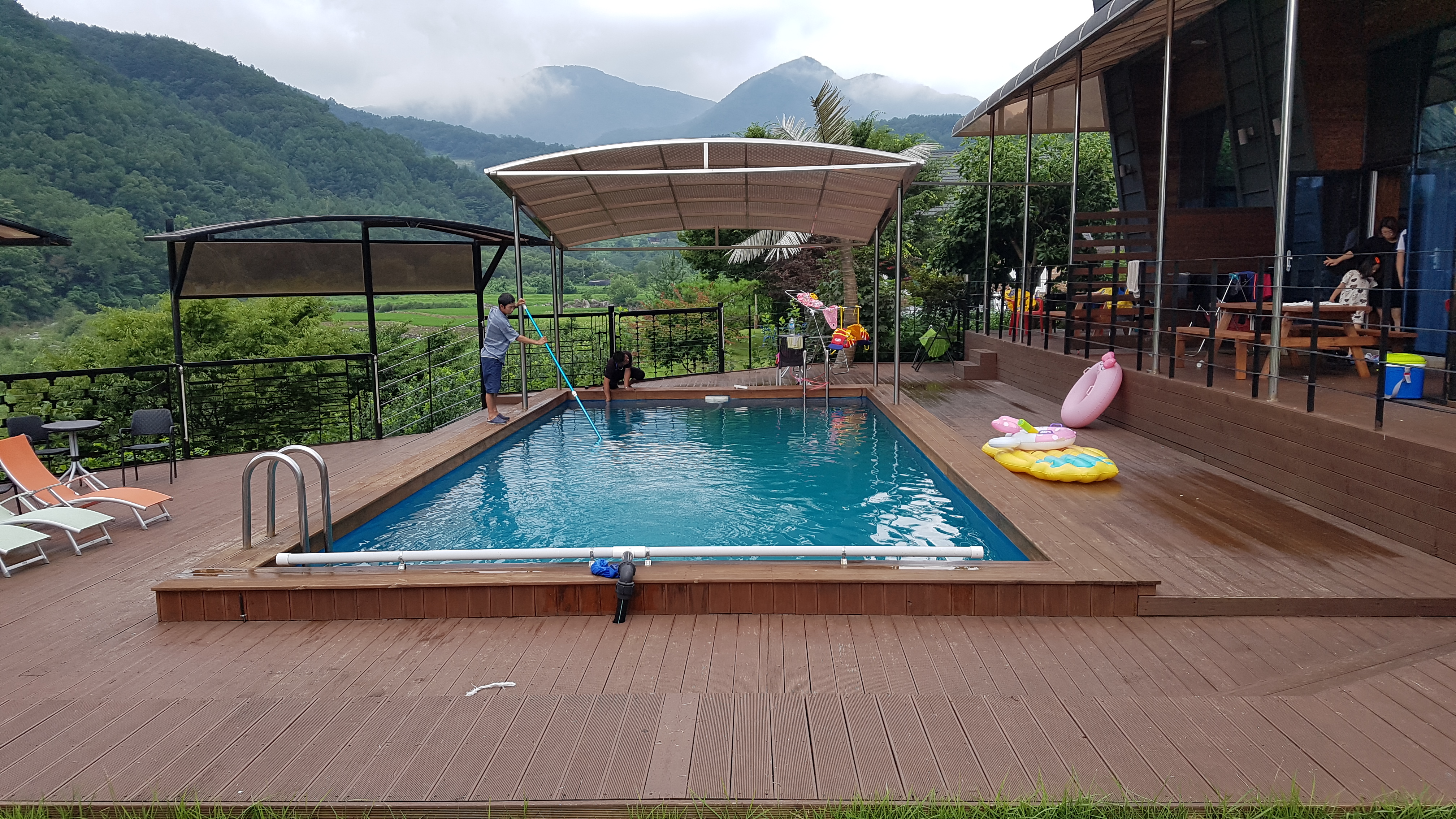 수영장은 전날 비가 와서 그랬는지 물이 조금 차가운 감이 있었습니다. 뜰채나 여과기 등으로 물에 이물질등은 최대한 수시로 제거해 주시더군요. 리컴A, 리컴B 숙소 앞에는 긴 의자가 있는데 최근 새 걸로 교체했습니다.