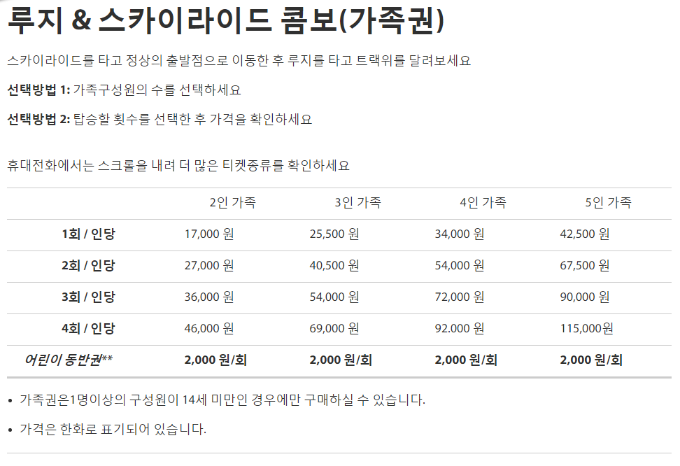 저희 집은 5세, 4세, 1세 아이가 있습니다. 결론부터 말씀드리면 자녀가 5세, 4세 이렇게 2명 있으신 가정은 아이들이 혼자서 탈 수 없는 경우가 대부분이고, 엄마, 아빠가 아이들을 각각 데리고 같이 탄다고 하면 아래와 같이 통영 루지 요금을 계산할 수 있습니다.