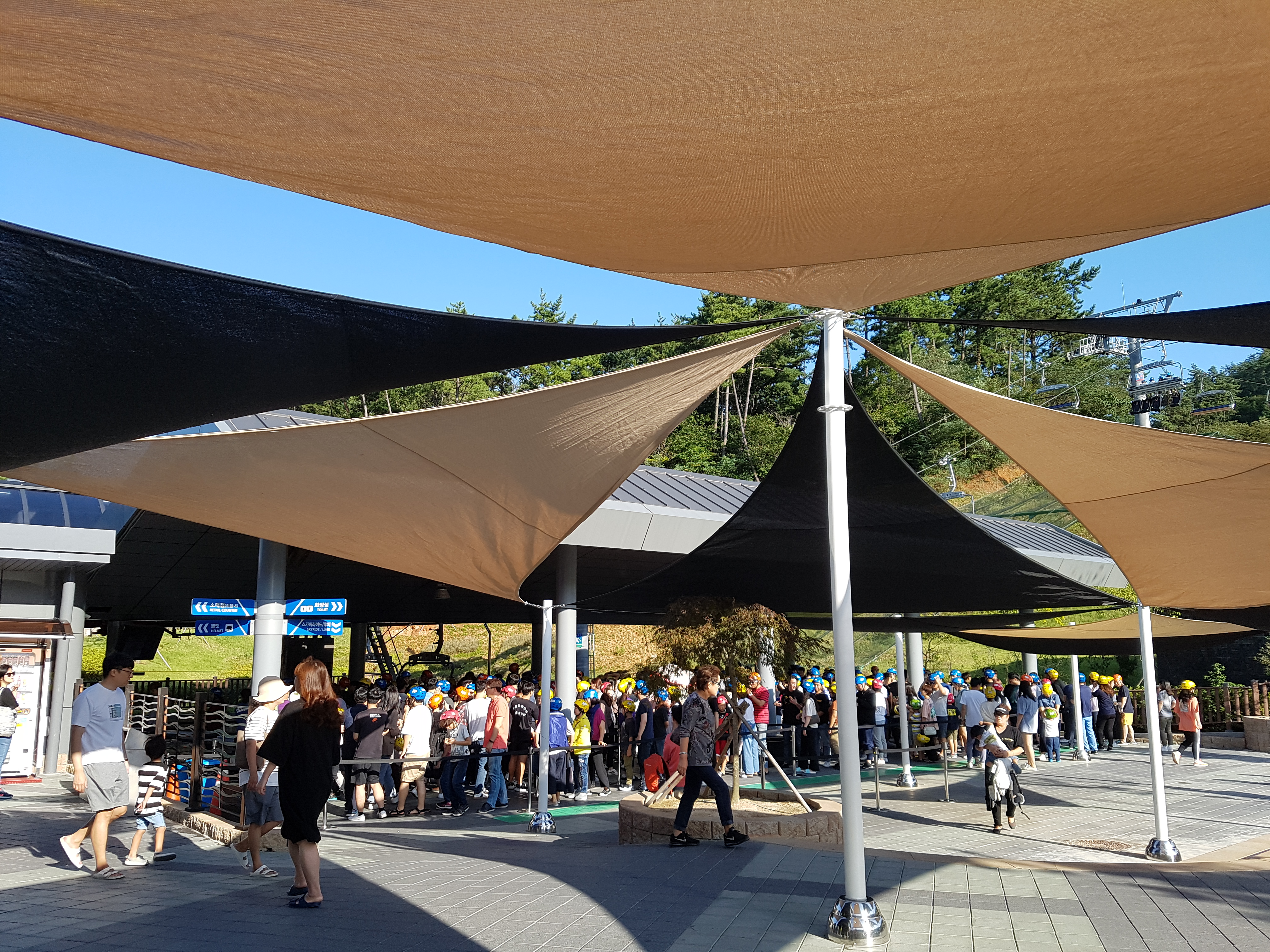 저 줄 끝에서 스카이 라이드라 불리는 리프트를 타는데 대기 시간이 대략 15 ~ 20분 정도, 리프트 타고 올라가는데 2 ~ 3 분, 정상에 도착해서 실제 루지 타는데 걸리는 시간도 대기 인원에 따라 다른데 적게는 5분 내외 걸립니다.