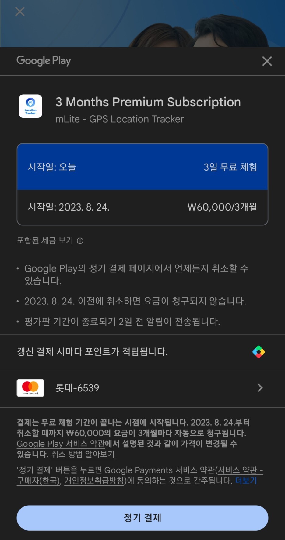 이 앱도 위치추적 어플 본연의 목적과 기능과는 무관해 보이는 채팅기능이 있습니다. 이 앱은 앱을 실행하자 마자 정기결제를 강요하는 화면이 뜹니다. 정기결제를 하지 않으면 다음 화면과 기능을 사용할 수 없는 구조 입니다. Google Play 리뷰글을 보면 대부분 '동의 없이 결제가 된다' '앱 삭제 이후에도 결제가 된다.' '정기 결재 취소가 없다' 등의 내용과 항의들이 많습니다.