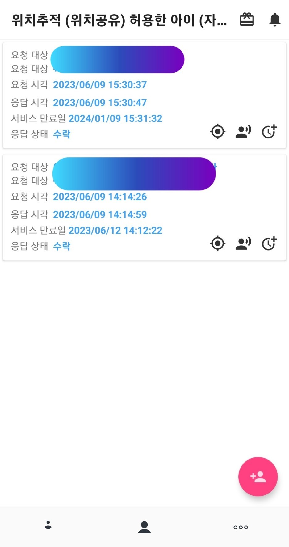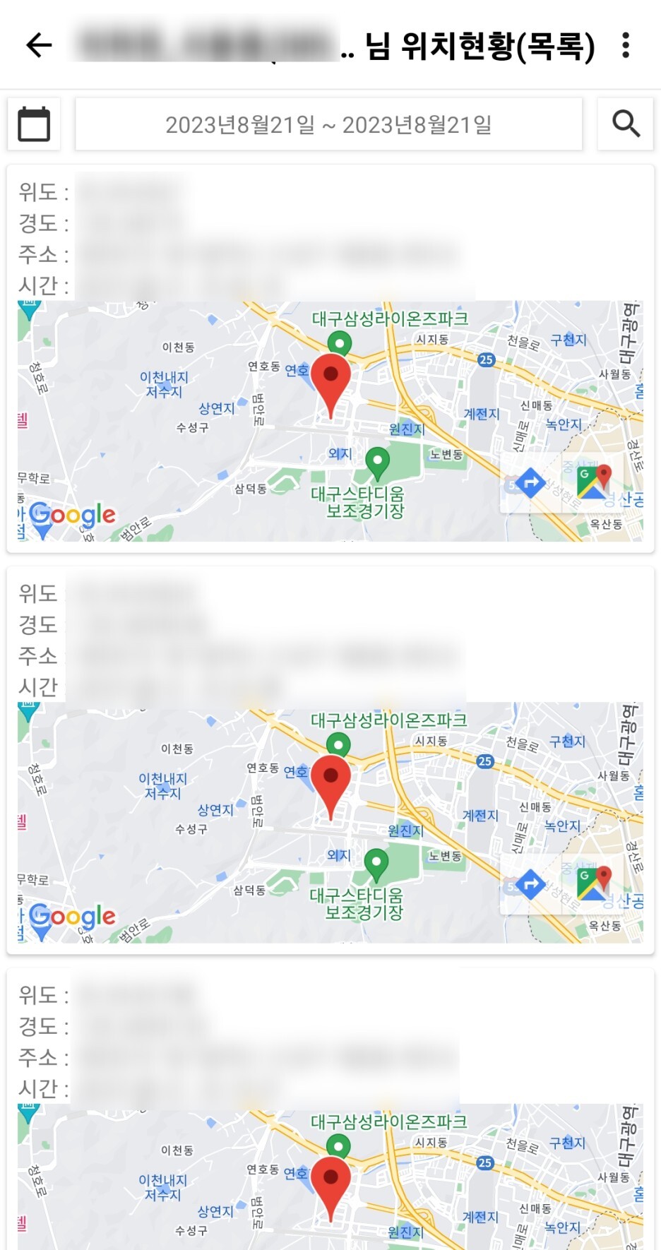 위치추적과 관련된 기능을 먼저 살펴보면 앱 실행하자마자 첫 화면에 내 자녀 및 친구로 등록된 이용자들의 위치 정보를 한 눈에 파악할 수 있습니다. 해당 정보를 클릭하면 가장 최근의 위치 정보 9개를 볼 수 있고, 날짜 검색 등을 통해 최대 1달 이내의 위치정보 목록을 확인할 수 있습니다.