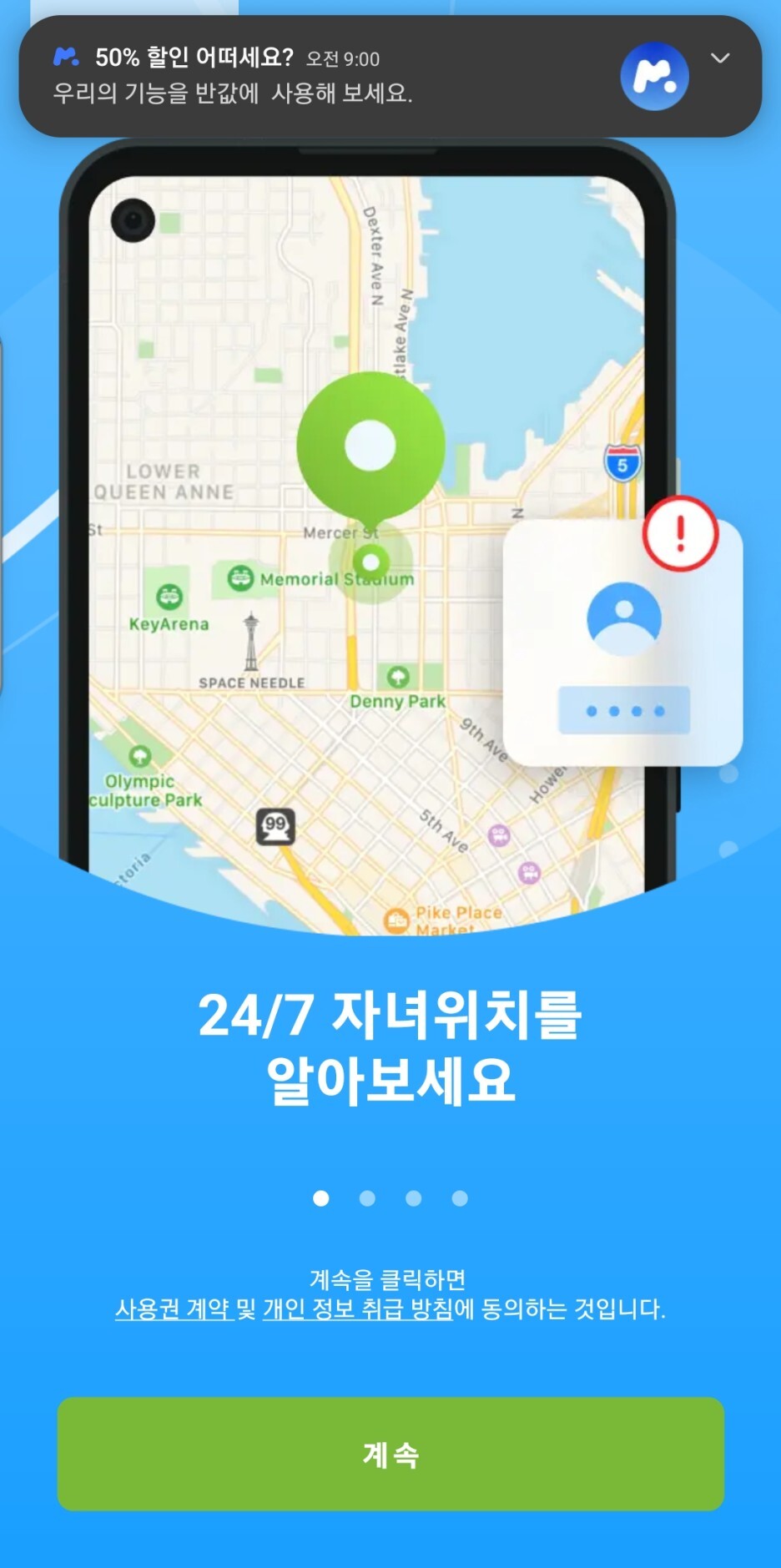 또 이 앱은 결제할 때까지 이 스크린샷의 상단에 50% 할인 어떠세요 라는 알림이 뜨면서 지속적으로 결제를 유도합니다. 이 50% 할인은 속칭 마트식 할인(이전에 실제 판매되는 가격에서 50% 할인이 된 것이 아니라, 50% 할인된 가격이 그냥 평소 판매되는 가격)으로 후술할 파인드 마이 키즈 앱에서도 같은식의 마트식 할인을 적용한 가격으로 지속적으로 결제를 유도합니다.